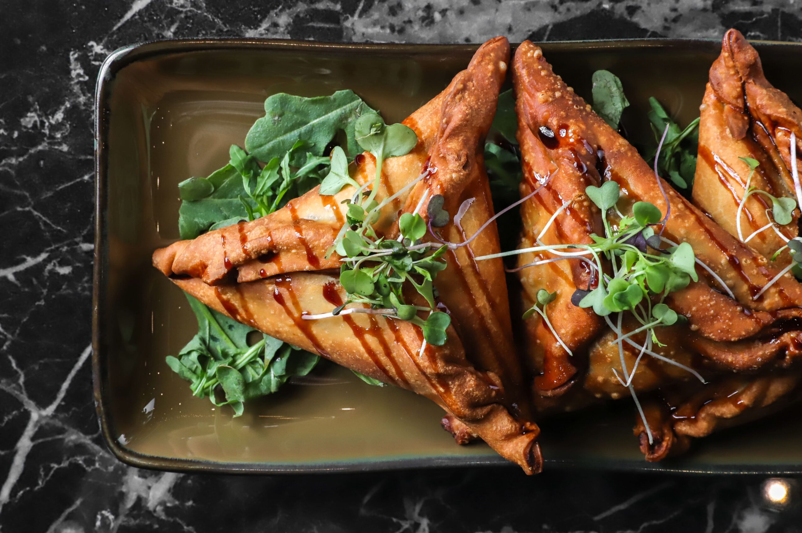 Seasoned potatoes and peas stuffed in a flaky pastry shell with spicy chutney and tamarind sauce