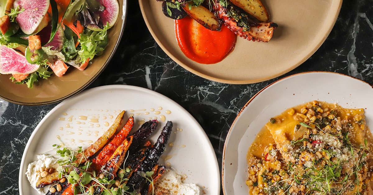 Herb panko crusted burrata with heirloom tomatoes, fresh figs, basil and a honey vinaigrette