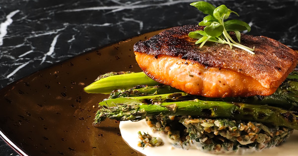 Ginger miso glazed salmon topped with pineapple relish