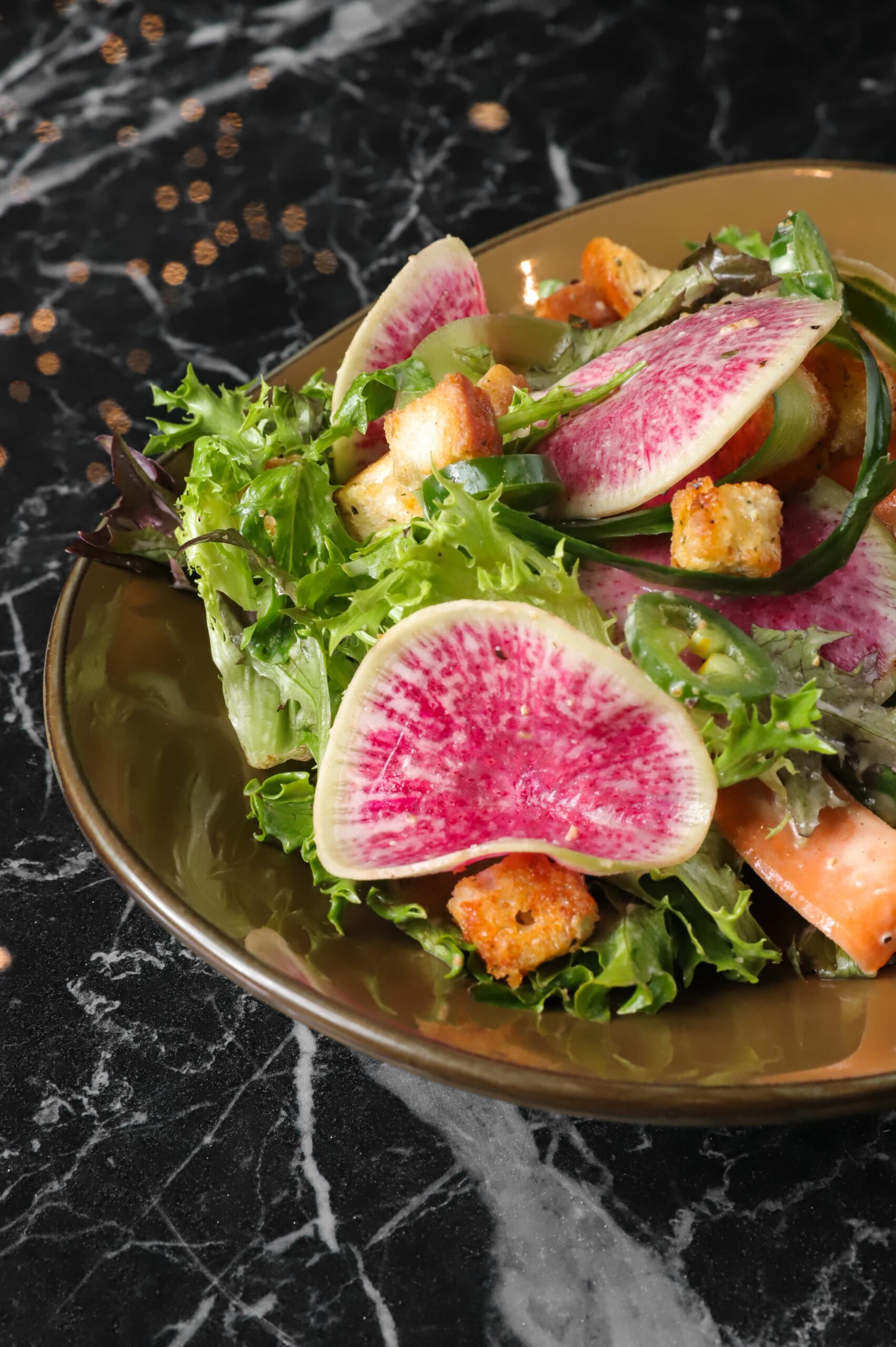Our house signature salad with Heritage greens, shaved carrots, watermelon radish, sliced jalapenos and ranch croutons with a green goddess dressing